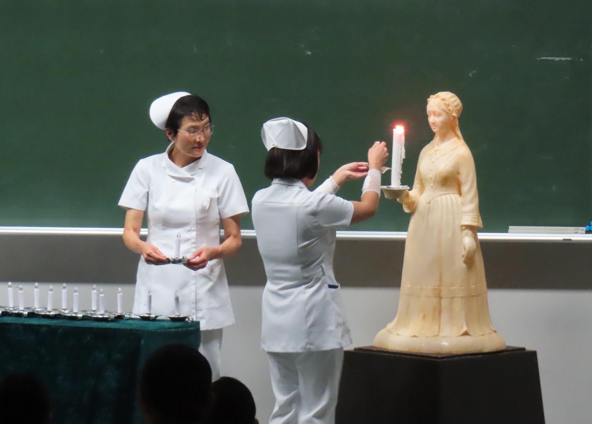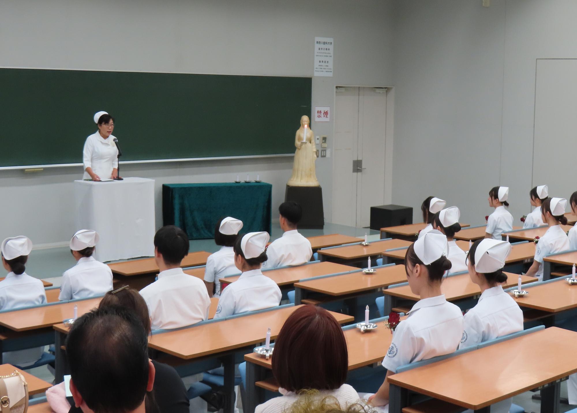 学生たちは、ケアの象徴であるナースキャップを教員から一人ひとり授けられ、さらにケアの精神を受け継ぐ象徴である蝋燭に灯をともすことで、医療人として歩み始める決意を新たに一歩を踏み出しました。
