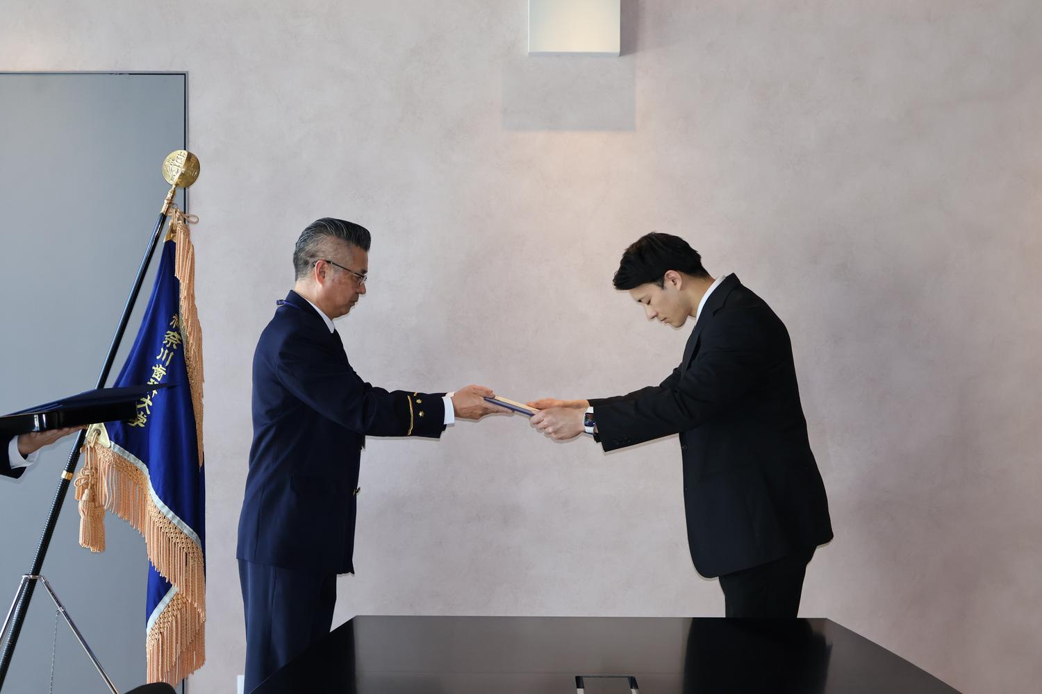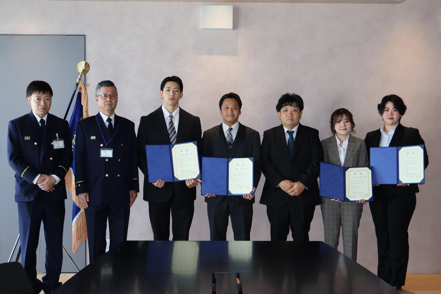 このたび、その功績に対し、横須賀市中央消防署より表彰が授与され、本学において表彰式を執り行いました。式典では、消防署関係者の皆様より当時の対応についての講評が述べられるとともに、救助された方にもご臨席いただき、感謝のお言葉を頂戴する機会となりました。