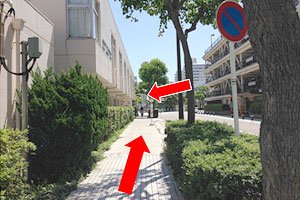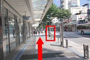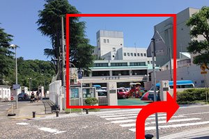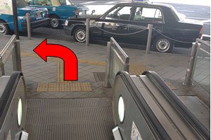 ③エスカレーターを降りたら、左へ曲がります。道路に沿ってまっすぐ進みます。
