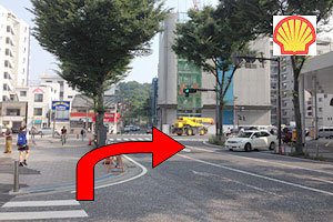 ⑨道路右側にガソリンスタンドを確認して、横断歩道を右に曲がります。