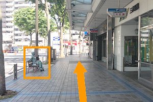 ④まっすぐ進むと歩道の右に、ベンチに座ったブロンズ像があります。チェックしてくださいね!